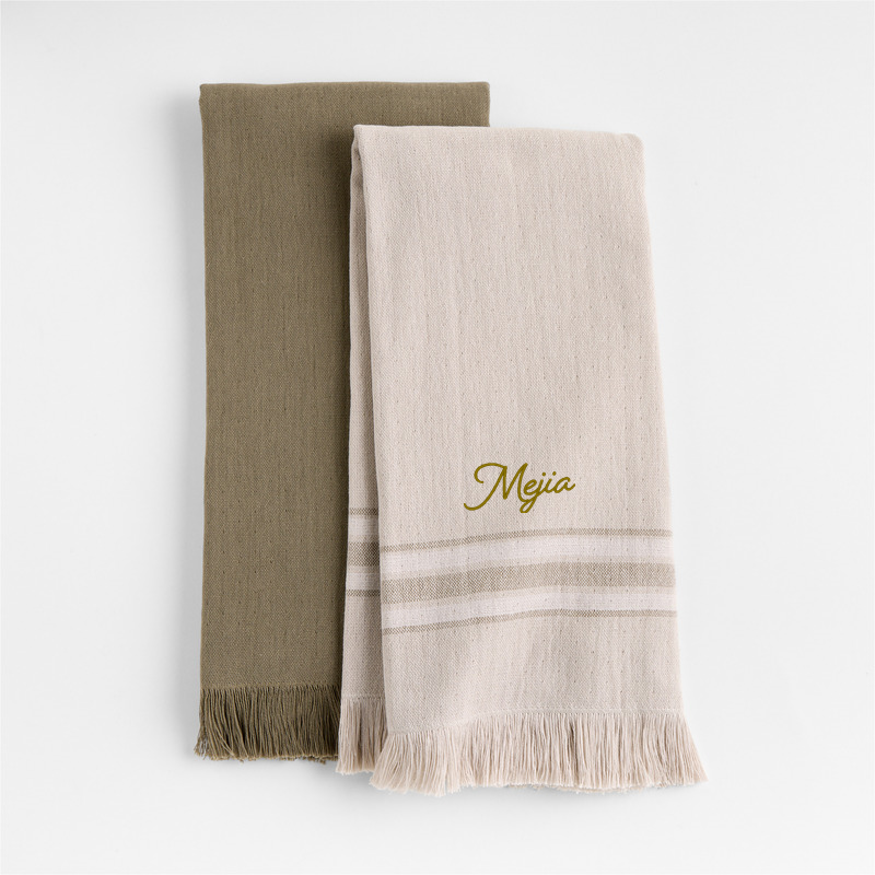 In stock and ready to ship Loading...Crate & BarrelSKU 339959Personalized Craft Sage Green Organic Cotton Dish Towels, Set of 2$44.95includes $15 personalization feeFree Shipping Eligible0 of 1 purchasedAdd to Cart