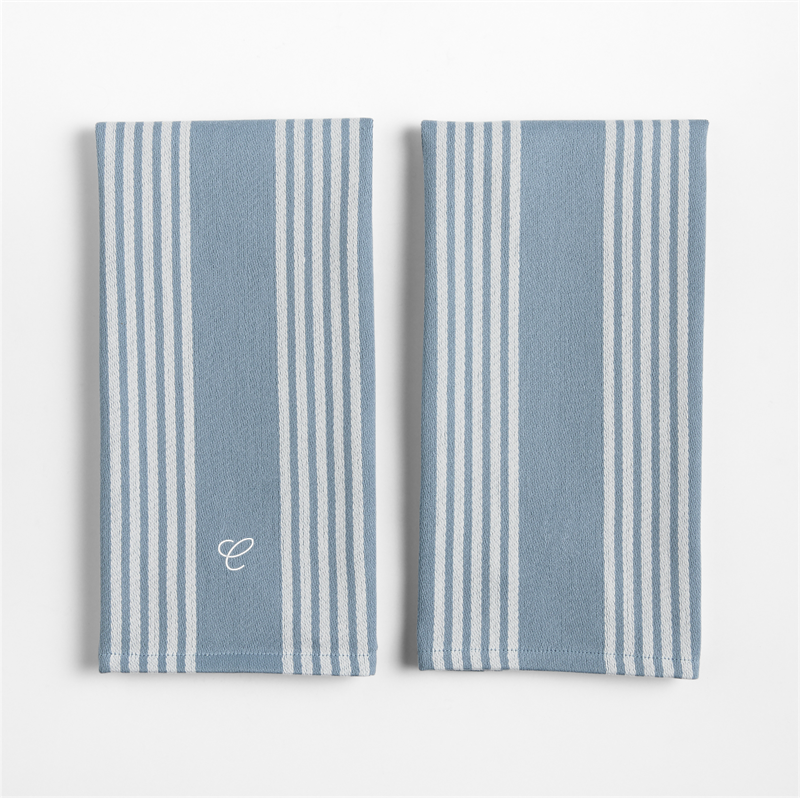 In stock and ready to ship Loading...Crate & BarrelSKU 427181Personalized Cuisine Harbor Blue with White Stripe Organic Cotton Kitchen Dish Towels, Set of 2$37.95includes $15 personalization feeFree Shipping Eligible0 of 1 purchasedAdd to Cart