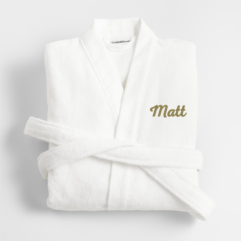 In stock and ready to ship Loading...Crate & BarrelSKU 569592Personalized Organic Turkish Cotton Crisp White Bath Robe L/XL$114.95includes $15 personalization feeFree Shipping Eligible0 of 1 purchasedAdd to Cart