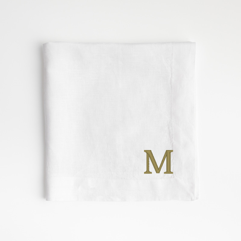 In stock and ready to ship Loading...Crate & BarrelSKU 223572Personalized Marin White EUROPEAN FLAX â„¢-Certified Linen Napkin$29.95includes $15 personalization feeShips free0 of 12 purchasedAdd to Cart