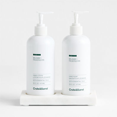 Purchase now and we'll ship when it's available. Estimated in early November 2025.Loading...Crate & BarrelSKU 526419Balsam + Frosted Fir Hand Soap and Lotion Set with White Marble Caddy$59.85Free Shipping Eligible0 of 1 purchasedAdd to Cart