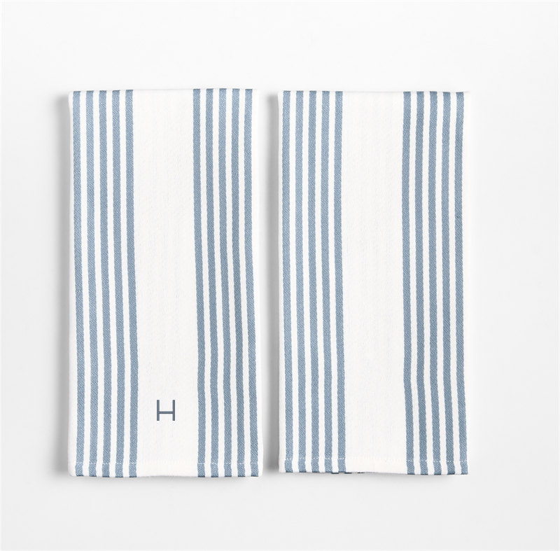 In stock and ready to ship Loading...Crate & BarrelSKU 463963Personalized Cuisine White with Indigo Stripe Organic Cotton Dish Towels, Set of 2$37.95includes $15 personalization feeFree Shipping Eligible0 of 1 purchasedAdd to Cart