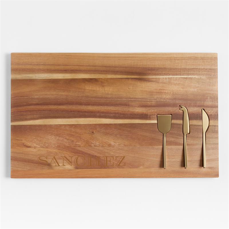 In stock and ready to ship Loading...Crate & BarrelSKU 105576Personalized Octavia Large Wood Board with Cheese Knives$104.95includes $15 personalization feeFree Shipping Eligible0 of 1 purchasedAdd to Cart
