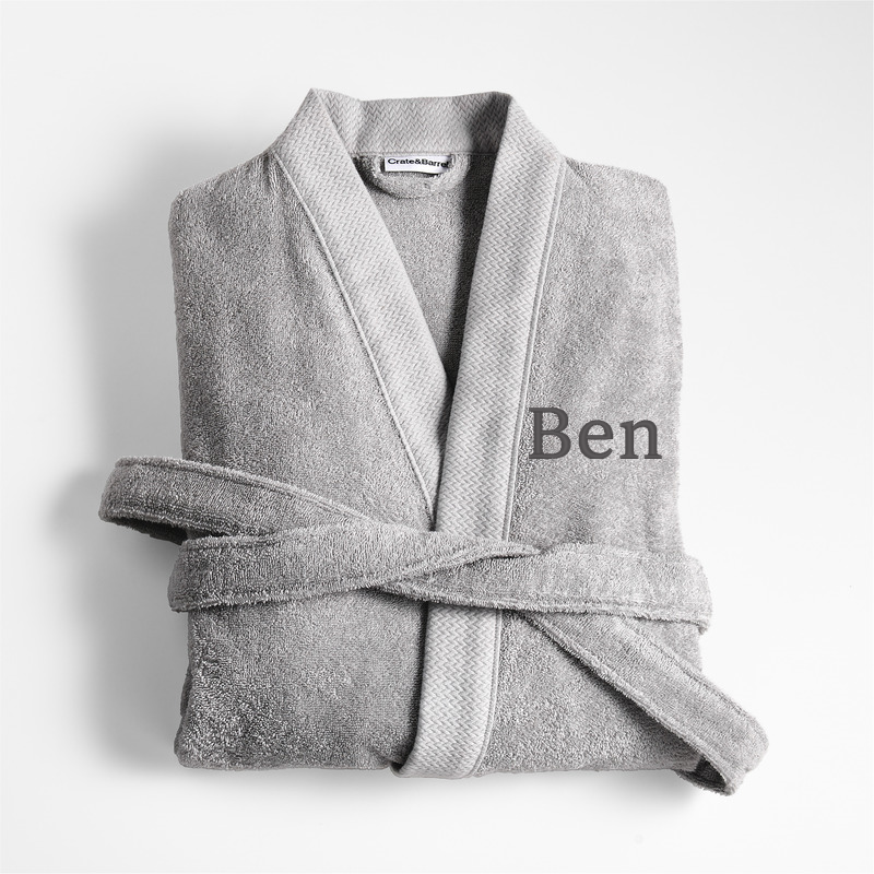 In stock and ready to ship Loading...Crate & BarrelSKU 569633Personalized Organic Turkish Cotton Grey Bath Robe L/XL$114.95includes $15 personalization feeFree Shipping Eligible0 of 1 purchasedAdd to Cart