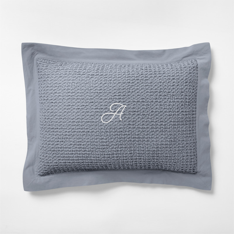 In stock and ready to ship Loading...Crate & BarrelSKU 343246Personalized Organic Cotton Waffle Smoke Blue Standard Bed Pillow Sham$55.95includes $16 personalization feeShips free0 of 2 purchasedAdd to Cart