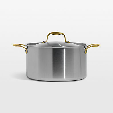 In stock and ready to ship Loading...Crate & BarrelSKU 430564Made In Stainless Clad 8-Qt. Stockpot with Antique Brass Hardware$249.00Ships free0 of 1 purchasedAdd to Cart