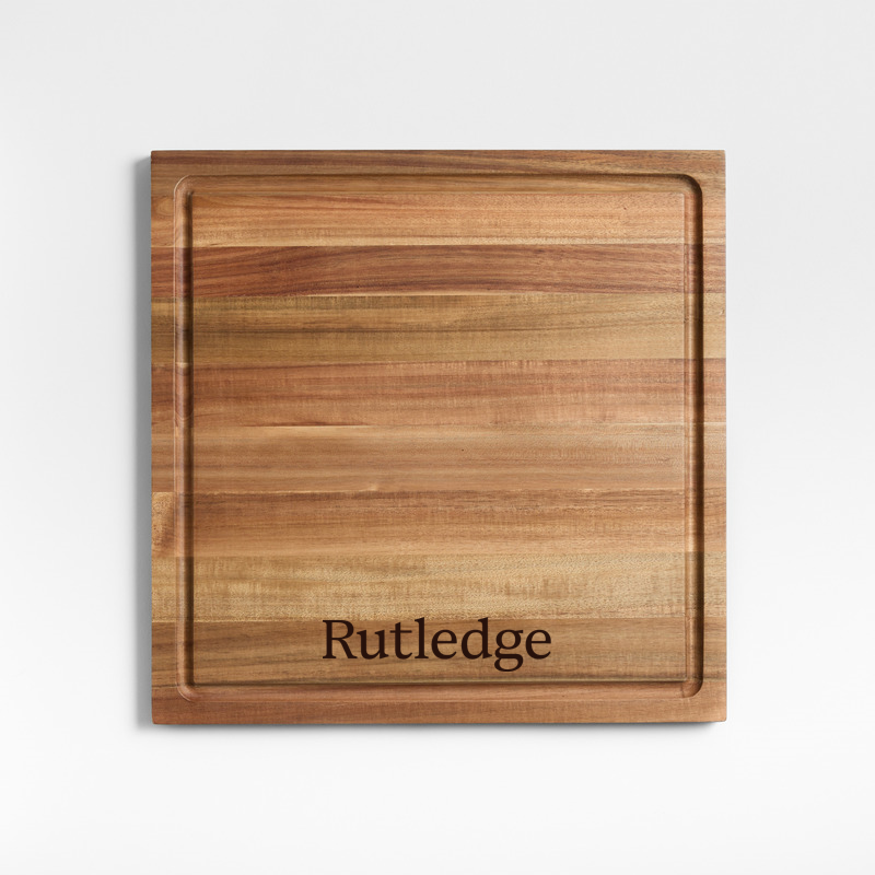 In stock and ready to ship Loading...Crate & BarrelSKU 408234Personalized Crate & Barrel Acacia Wood Cutting Board 16"x16"x0.75"$64.95includes $15 personalization feeShips free0 of 1 purchasedAdd to Cart