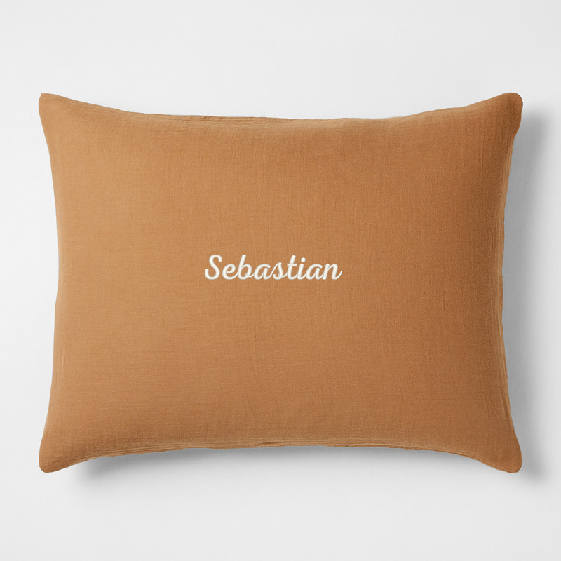 In stock and ready to ship. Loading...Crate & KidsSKU 229293Personalized Supersoft Brulee Brown Organic Cotton Gauze Kids Pillow Sham$49.95includes $15 personalization feeShips free0 of 1 purchasedAdd to Cart