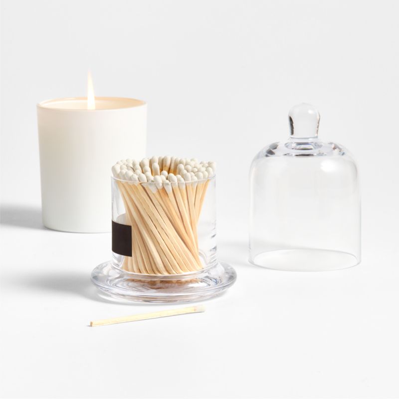 Our match-filled cloche takes up residence on a mantel, credenza or bookshelf, ready to light a nearby candle. The clear glass vessel has a sturdy rounded base and a bell-shaped top that lifts off to access the wooden matches stored inside. A black striker strip on the exterior makes it easy to ignite the matches. Package with one of our pillar candles or pair of tapers for a lovely gift.