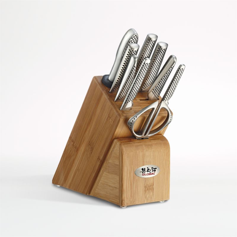 Crafted in Japan using a manufacturing method inherited from the Samurai sword, this 10-piece knife set boasts distinctive modern design. The one-piece stainless steel construction, unique convex edges and a dramatic signature dimpled pattern on the handles ensure professional performance. Slip-resistant, ergonomic hollow handles are filled with sand for ideal weight and balance. The set includes a bamboo block filled with an 8.5-inch bread knife, 8-inch chef's knife, 6.25-inch flexible boning knife, 5.5-inch vegetable knife, 4.25-inch utility knife, 4-inch straight paring knife, 3-inch peeler knife, 8.5-inch ceramic sharpening rod and kitchen shears.