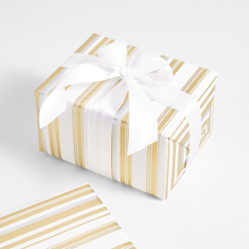 Gold, silver and snow-white stripes pattern our exclusive gift wrap with a fresh and graphic look. We love the dynamic rhythm of the varied-width lines and the way the metallics add a touch of wintry glam under the tree. Perfect for a modern Christmas aesthetic, the winter stripe wrapping paper also suits winter birthdays and other holidays and gift-giving occasions.