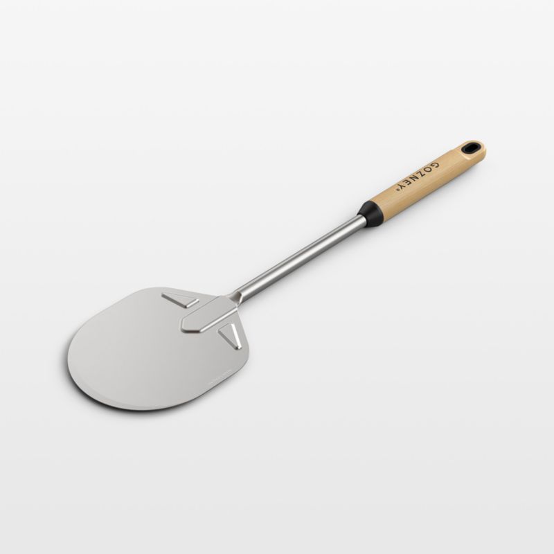 Transfer pies into and out of your portable pizza oven like a pro. Beveled on its edge to slide smoothly under crusts, the strong, wide stainless steel peel handles lifting and rotating pizzas with ease. The short wooden handle provides sturdy control and fits easily with your camping supplies or beach gear. The Venture turning peel pairs with the Gozney Tread oven for pizza parties anywhere.