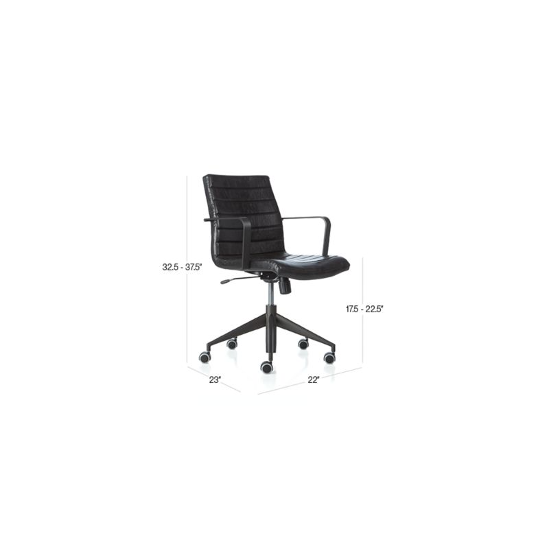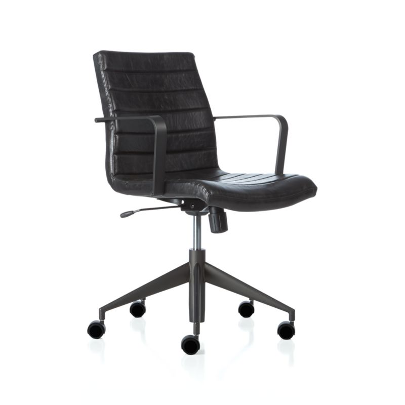 Our Graham office chair scores modern style points with a streamlined profile and tailored black faux leather. Handsome, channel-seamed upholstery is complemented by sleek gunmetal arms and tapered base to shape a supportive seat and give the chair its architectural flair.