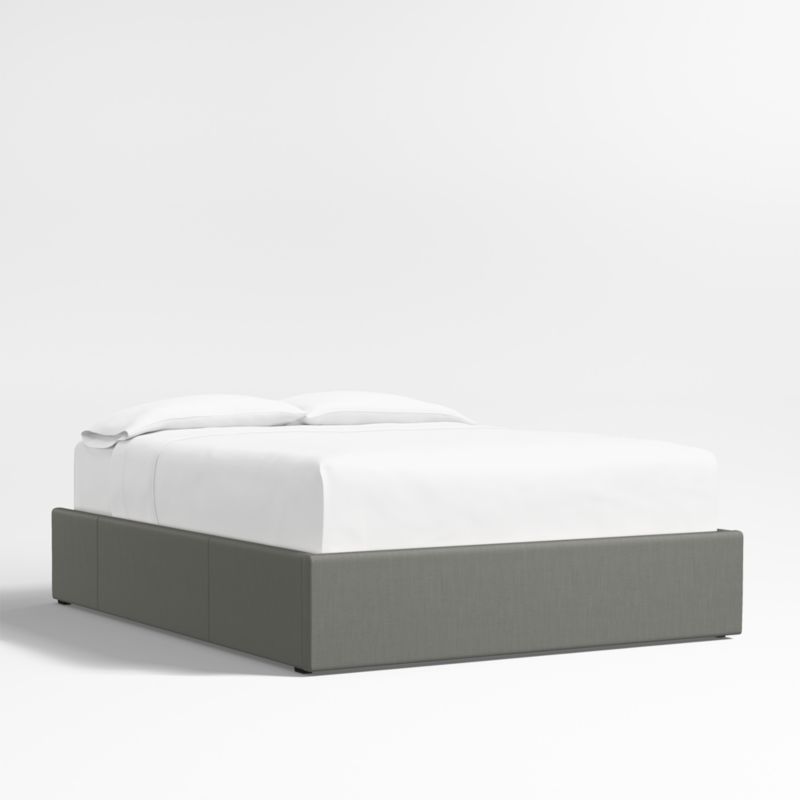 Our custom bed collection lets you mix and match our top-selling headboards and bases for a look that's truly yours. A great choice for smaller, storage-challenged bedrooms, this base includes three roomy drawers—one on each side and one at the foot of the bed—for storing off-season clothes and extra blankets. As a plus, the side drawers open with just enough clearance to avoid hitting nightstands and other bedroom furniture. Padded and neatly tailored, the storage bed is upholstered in a grey linen-blend fabric. Our exclusive storage bed base is designed to fit perfectly with any of our signature headboards.