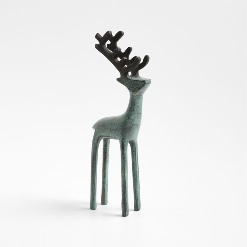 We've updated our bestselling reindeer with a green patina for the look of impeccably aged bronze sculptures. Cast by hand with modern, abstracted silhouettes and flowing curves in durable aluminum, the reindeer is sculpted with elongated legs and rounded cuteness that add a playful element to holiday decor. A verdigris finish gives it the unique color, subtle texture and charm of a flea market find. Due to the artisanal patina created by hand, each caribou is fascinatingly unique. Group with our other exclusive reindeer sculptures to create a miniature herd on your fireplace mantel, buffet or dining room table.
