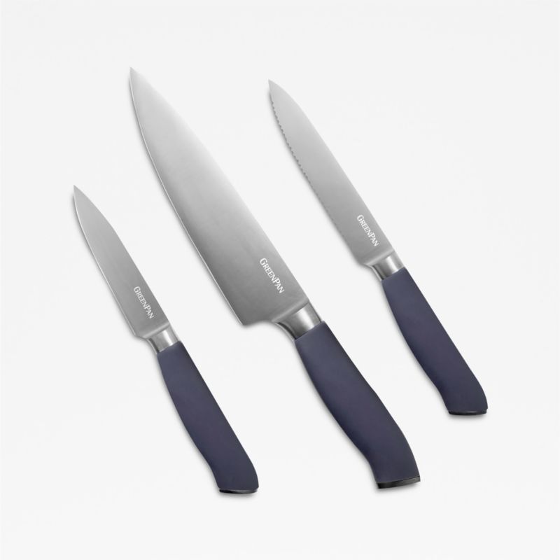 Tackle a wide range of cutting tasks with confidence using this three-piece knife set. The blades, made of partially recycled stainless steel, are coated with titanium for durability, frictionless cutting and sharpness that lasts. Skilled craftspeople sharpen the knives by hand, and grey ergonomic handles provide a secure, comfortable grip—even with wet hands. Dishwasher-safe for easy cleanup, this essential set includes a 4-inch paring knife, 5-inch utility serrated paring knife and 7-inch chef's knife.
