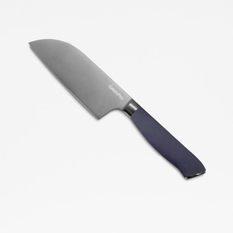 Chop vegetables, slice cheese, cut meat and mince herbs with confidence using this santoku knife. The blade, made of partially recycled stainless steel, is coated with titanium for durability, frictionless cutting and sharpness that lasts. Skilled craftspeople sharpen the knife by hand, and a grey ergonomic handle provides a secure, comfortable grip—even with wet hands. Dishwasher-safe for easy cleanup, this titanium santoku knife is a kitchen essential.