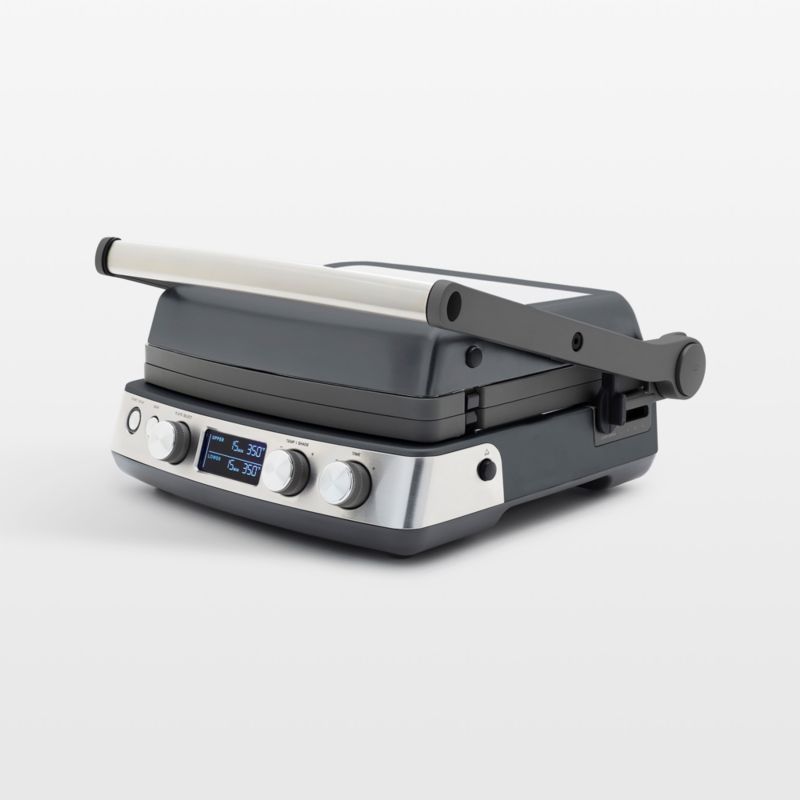 Grill burgers, press sandwiches, sear steaks and more with this multipurpose grill. Featuring interchangeable grill and griddle plates, the versatile appliance combines a panini press, contact grill, electric griddle and other countertop cookers in one. Coated in a ceramic non-stick finish infused with diamonds, the cast aluminum plates conduct heat evenly and efficiently. The grill opens flat to expand the cooking surface area for feeding a crowd. Dual-zone heating allows for independent control of each plate, and the one-touch sear control provides a perfect finishing touch. When your lunch paninis or Sunday brunch is complete, the plates clean up easily in the dishwasher and the grill rests vertically for compact storage.