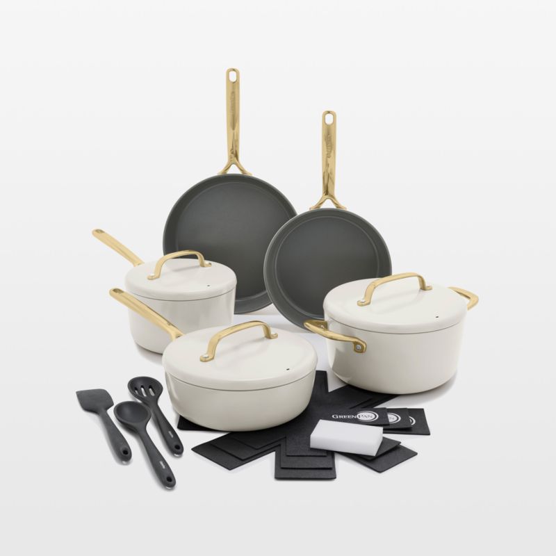 GreenPan's new advanced ceramic non-stick cookware represents 15 years of innovation. This versatile GP5 cookware set fries, sears, simmers, stews, bakes and more. Infused with diamonds, the multilayer ceramic non-stick coating stands up to metal utensils, high heat, dishwashers and daily use. Heavy-gauge aluminum bases heat evenly, flexing to keep the pans flat so cooking oils don't pool. Fitted with champagne gold-finished handles that stay cool—and look glam—on the stovetop, the cloud-inspired cream pans go from kitchen to table for a beautiful presentation.