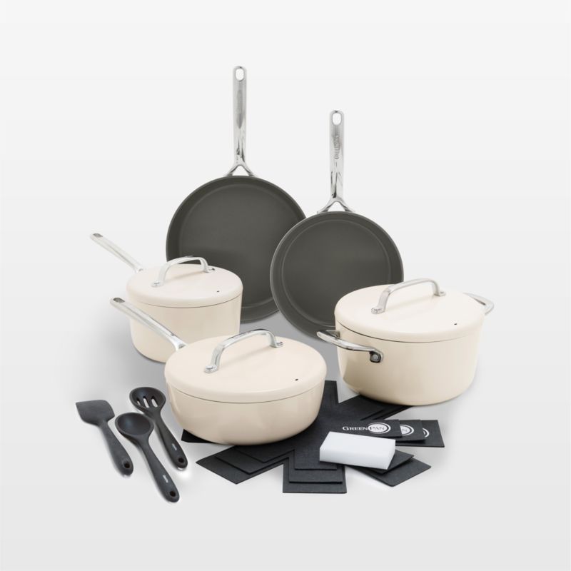 GreenPan's new advanced ceramic non-stick cookware represents 15 years of innovation. This versatile GP5 cookware set in elegant cream fries, sears, simmers, stews, bakes and more. Infused with diamonds, the multilayer ceramic non-stick coating stands up to metal utensils, high heat, dishwashers and daily use. The heavy-gauge aluminum base heats evenly, flexing to keep the pans flat so cooking oils don't pool. Fitted with stainless steel handles that stay cool on the stovetop, the pans won't release harmful fumes even when overheated.