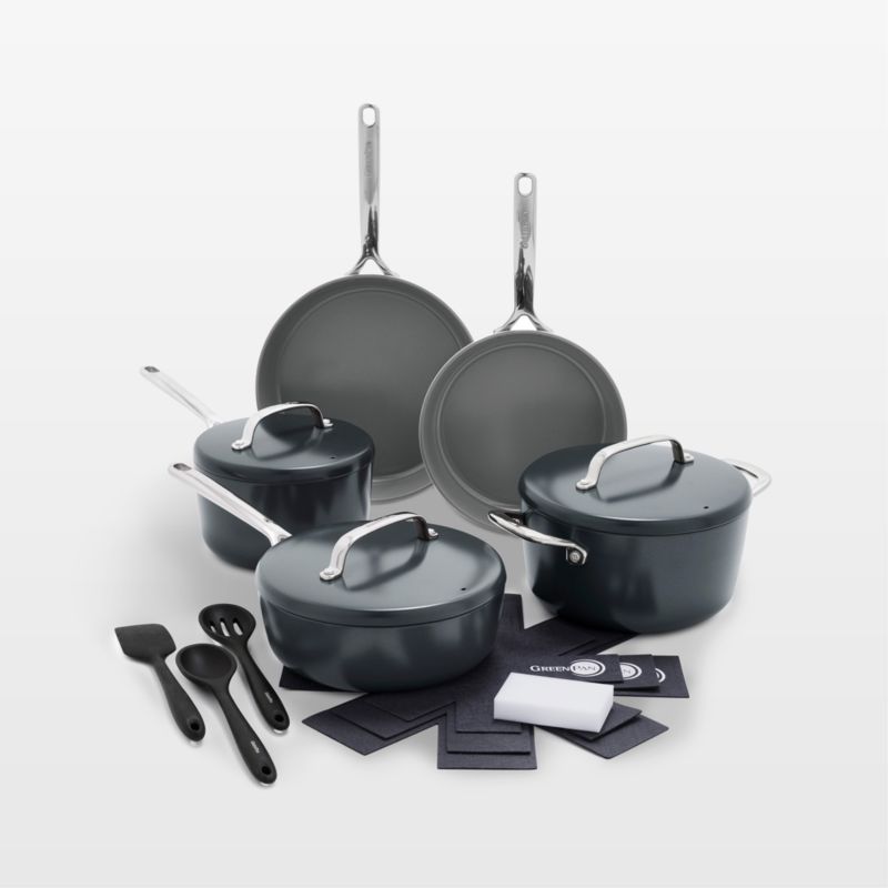 | | Set includes: 9.5" and 11" fry pans, 3-qt. covered saute pan, 3.25-qt. saucepan, 5-qt. lidded stockpot; small, medium and large polyester pan protector sheets; silicone and nylon spoon, slotted spoons and spatula; melamine Renew sponge |