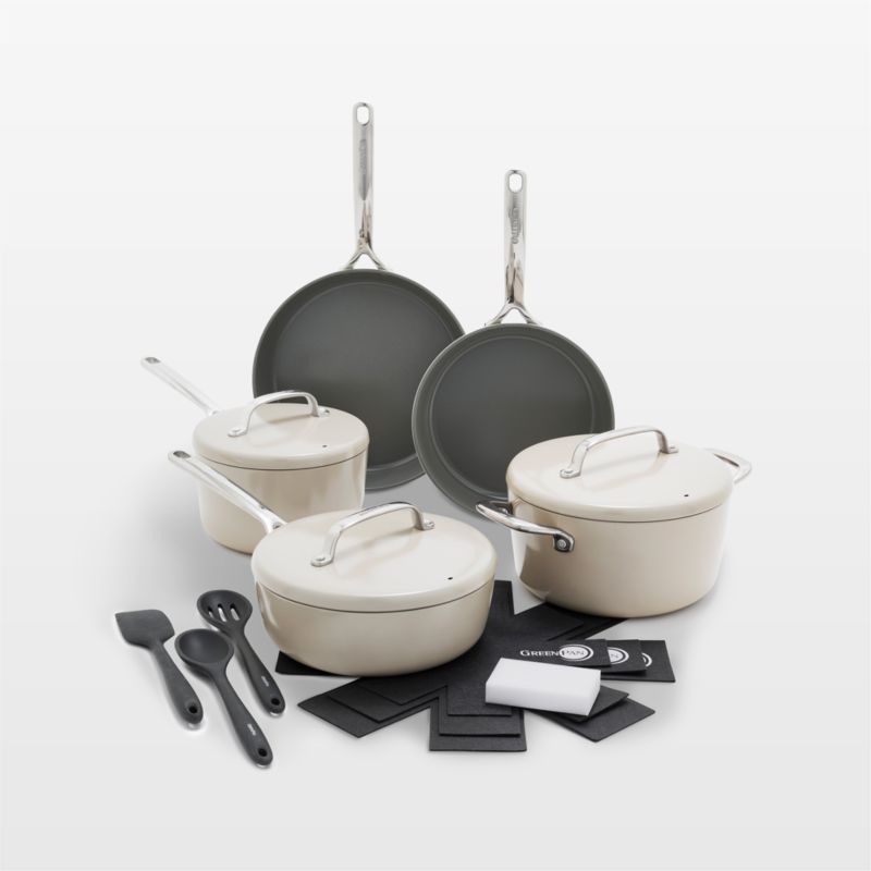GreenPan's new advanced ceramic non-stick cookware represents 15 years of innovation. This versatile GP5 cookware set in chic taupe fries, sears, simmers, stews, bakes and more. Infused with diamonds, the multilayer ceramic non-stick coating stands up to metal utensils, high heat, dishwashers and daily use. The heavy-gauge aluminum base heats evenly, flexing to keep the pans flat so cooking oils don't pool. Fitted with stainless steel handles that stay cool on the stovetop, the pans won't release harmful fumes even when overheated.