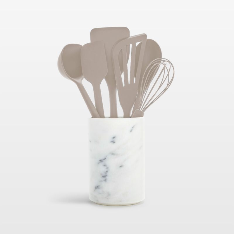 Sleek, seamless and effortlessly chic in classic colors, these six utensils elevate everyday cooking and food prep. The silicone-coated tools are sturdy with metal cores, flexible edges and anti-slip handles for excellent control. Ideal for ceramic non-stick cookware, the utensils gather for counter and stovetop access in a white ceramic crock that resembles marble.