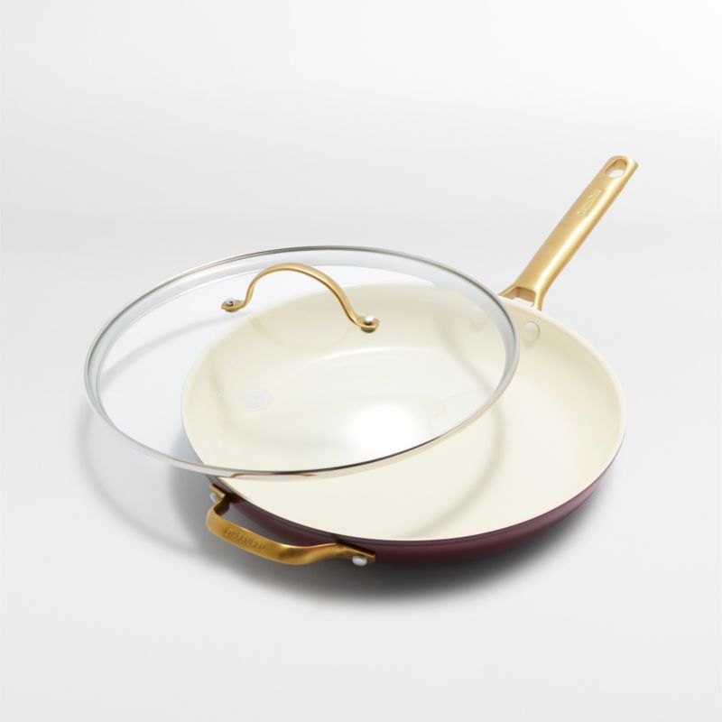 This GreenPan Reserve frying pan infuses world-class technology with bold, modern style. Matte gold handles adorn the sleek skillet, contrasting with the wine-inspired mauve exterior and adding serious glam. Constructed with duo-forged, hard-anodized aluminum, the lidded fry pan provides even heat distribution and superior performance. A diamond-infused Thermolon surface offers healthy cooking as well as easy release and clean up. And due to the advanced ceramic coating technology, you only need to cook on medium heat.