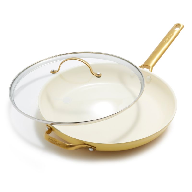 [Family This GreenPan Reserve frying pan infuses world-class technology with bold, modern style. Matte gold handles adorn the sleek skillet, contrasting with the sunny yellow exterior and adding serious glam. Constructed with duo-forged, hard-anodized aluminum, the lidded fry pan provides even heat distribution and superior performance. A diamond-infused Thermolon surface offers healthy cooking as well as easy release and clean up. And due to the advanced ceramic coating technology, you only need to cook on medium heat.