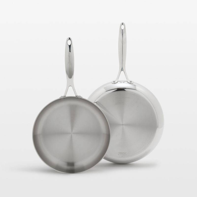 Made with an aluminum core clad in stainless steel, these frying pans are rugged and warp-resistant and provide excellent heat distribution and retention for cooking a wide range of foods. Mirror-finished on the exterior with a brushed matte interior, the uncoated fry pans in the two-piece set are durable, non-reactive and easy to use and care for. Riveted, ergonomic handles make it safe and comfortable to transfer the skillets from stovetop to oven to table.
