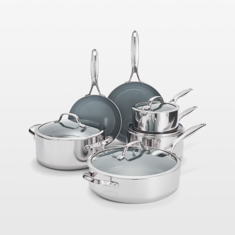Stylish and durable, this multi-layer stainless steel cookware set is coated with a patented ceramic non-stick coating that heats effectively to sear and brown beautifully. The pale grey finish stands up to metal utensils and is reinforced along the rims to prevent chipping. Polished to a mirror finish, the exteriors and handles shine on the stove, table or pot rack. Glass lids seal in heat and moisture while letting you keep an eye on your meal's progress.