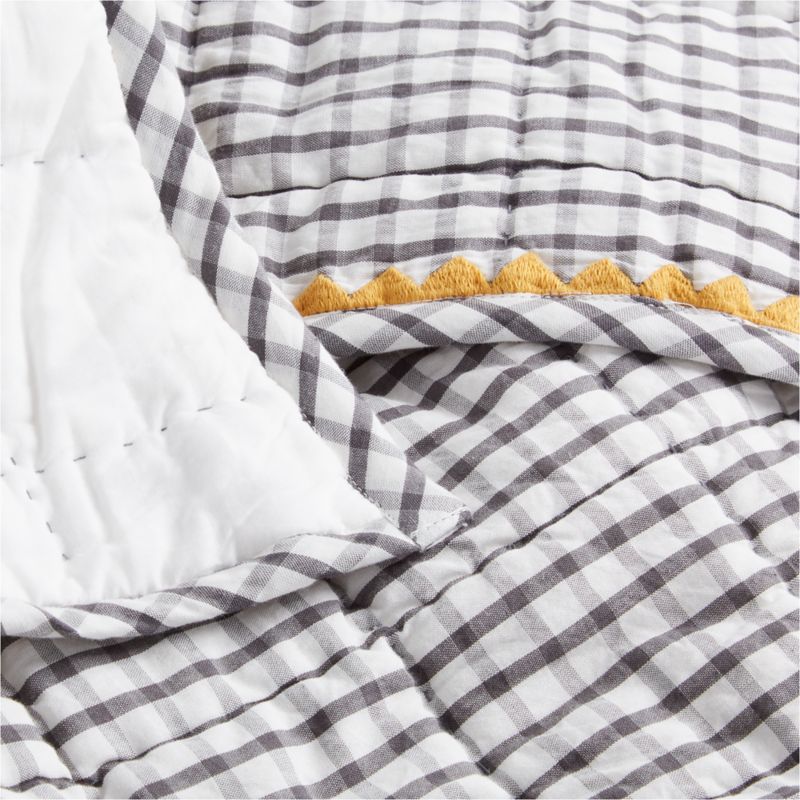 The vintage charm of a windowpane plaid, reinterpreted in modern, sustainably sourced organic cotton. The soothing grey-and-white check is bordered in contrasting goldenrod embroidery that lends an heirloom-quality detail. Reverses to solid white. Complete the timeless look with the matching Grey Windowpane Plaid Organic Cotton Baby Crib Skirt.