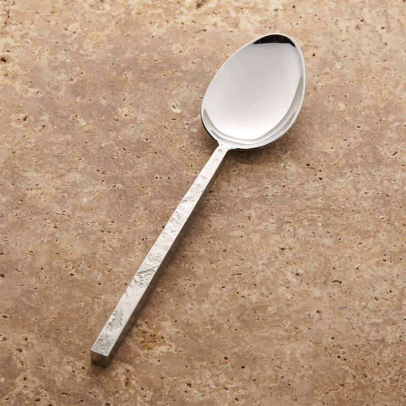 Artisanal hand-forged handles with unique texture and a subtle silver patina contrast with mirror-polished heads for striking, contemporary serving pieces. Handle finishes on these rustic, organic pieces will vary according to subtle differences in the handcrafted process and natural pitting.