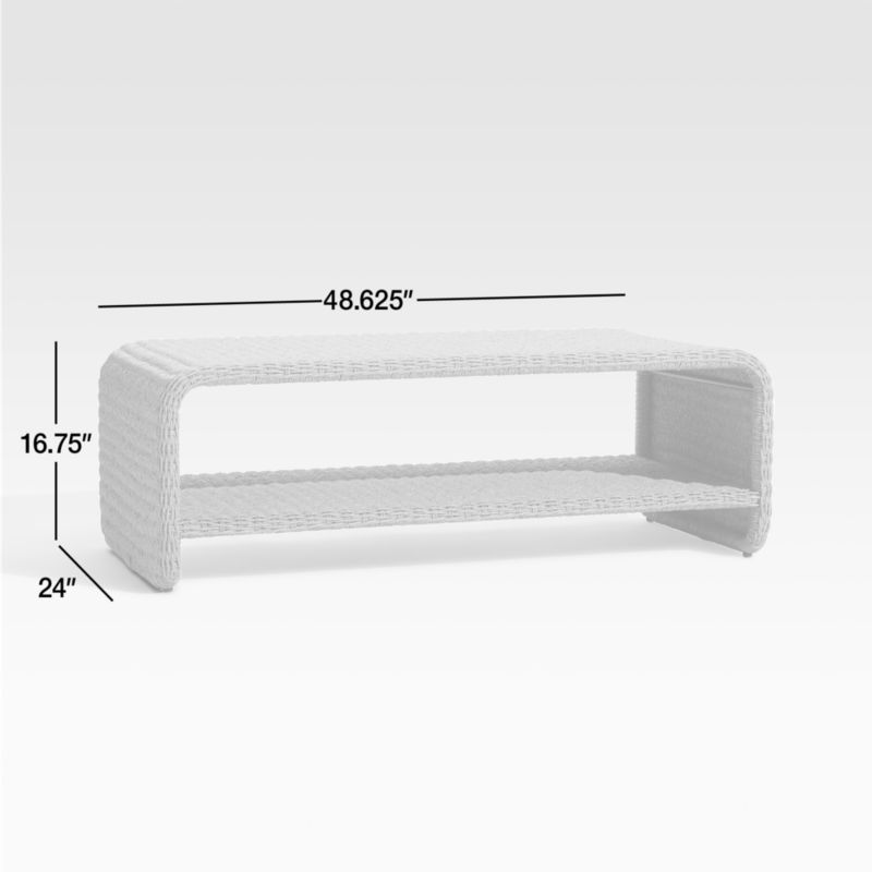 The definition of coastal modern, our Grotto outdoor collection brings a breezy look to classic wicker with sculpted silhouettes. All-weather resin wicker weaves the coffee table's breezy frame with rounded edges and waterfall legs. An open shelf provides the perfect place to store summer reading or a nighttime throw. The Grotta outdoor wicker coffee table is a Crate & Barrel exclusive.