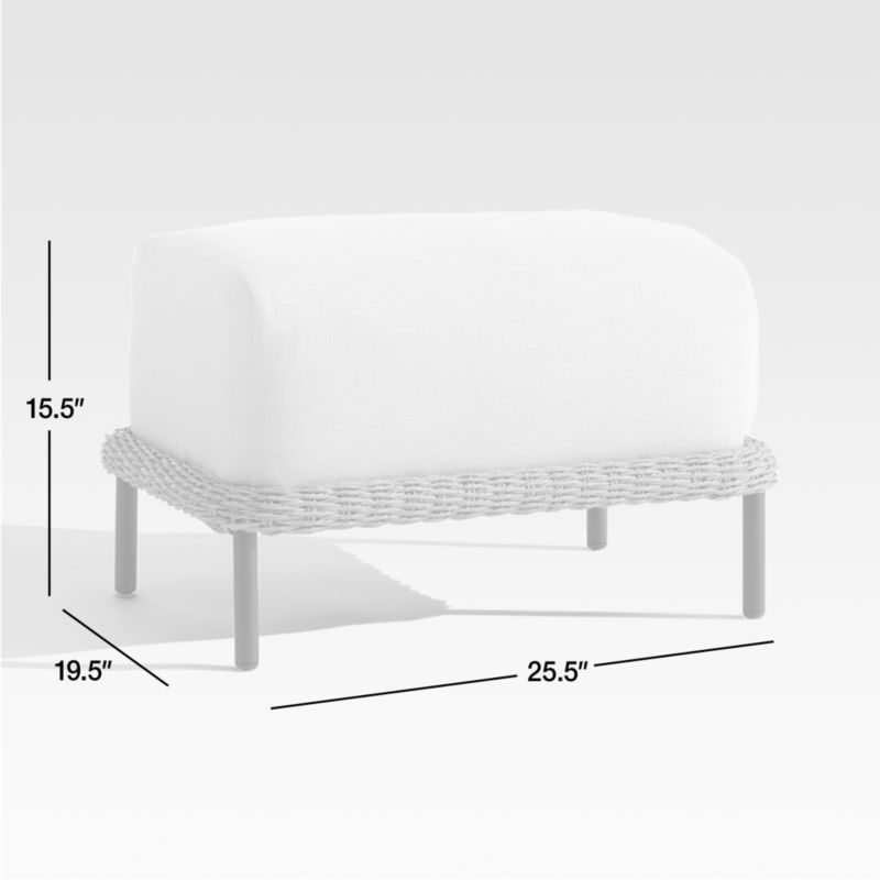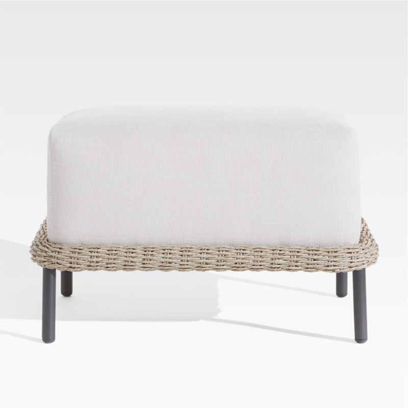 The definition of coastal modern, our Grotto outdoor collection brings a breezy look to classic wicker with sculpted silhouettes and clean-lined, sink-in cushions. All-weather resin wicker weaves the ottoman's breezy base, which rests on slim stainless steel legs finished in matte black. The delightfully soft seat cushion beckons with bold proportions and polyester upholstery in fresh ivory. The Grotta outdoor wicker ottoman is a Crate & Barrel exclusive.