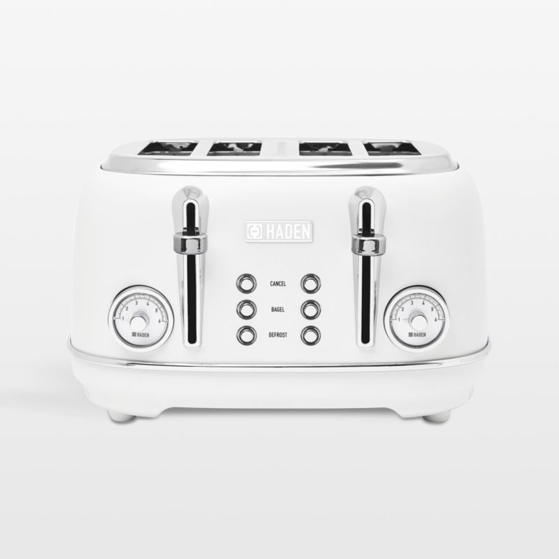 Inspired by traditional British homes, HADEN of England updates the stalwart toaster with modern hues and features while celebrating this kitchen essential. This stainless steel toaster coated in creamy ivory starts your day with perfectly browned toast and a soothing, sophisticated neutral. The classic curves, chromed accents and charming temperature gauge offer a bit of retro style. Six browning levels ensure every bagel, English muffin and slice of bread is toasted precisely to your liking—and the four extra-wide slots accommodate all of your favorites. Pair with the matching electric kettle for a coordinated countertop.