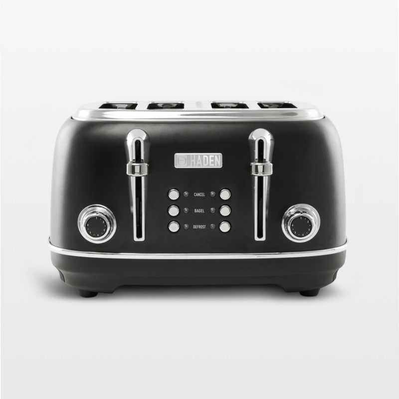 Finished in matte black with chrome details, this stainless steel toaster starts your day with perfectly browned toast and a sleek look. Inspired by traditional British homes, Haden of England updates the stalwart appliance with modern hues and features while classic curves and metallic accents add retro style. Four extra-wide, self-centering slots ensure slim toaster pastries and thick bagels cook evenly. Pair the black and chrome toaster with the matching electric kettle for a coordinated kitchen.