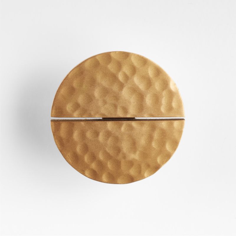 Whether you are doing a full renovation or just need a quick refresh, our hammered brass knob instantly breathes new life into your kitchen cupboards, bedroom furniture or office cabinetry. Hammered to create a soft, pebbled texture, gleaming brushed brass shapes a split circle. The linear cutout adds subtle but eye-catching appeal. Available in brushed black, nickel and brass, our hammered knobs are Crate & Barrel exclusives.