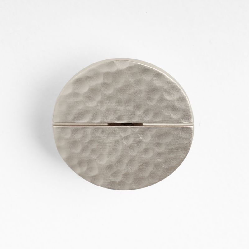Whether you are doing a full renovation or just need a quick refresh, our hammered knob instantly breathes new life into your kitchen cupboards, bedroom furniture or office cabinetry. Hammered to create a soft, pebbled texture, brass with a brushed nickel finish shapes a split circle. The linear cutout adds subtle but eye-catching appeal. Available in brushed brass, black and nickel, our hammered knobs are Crate & Barrel exclusives.