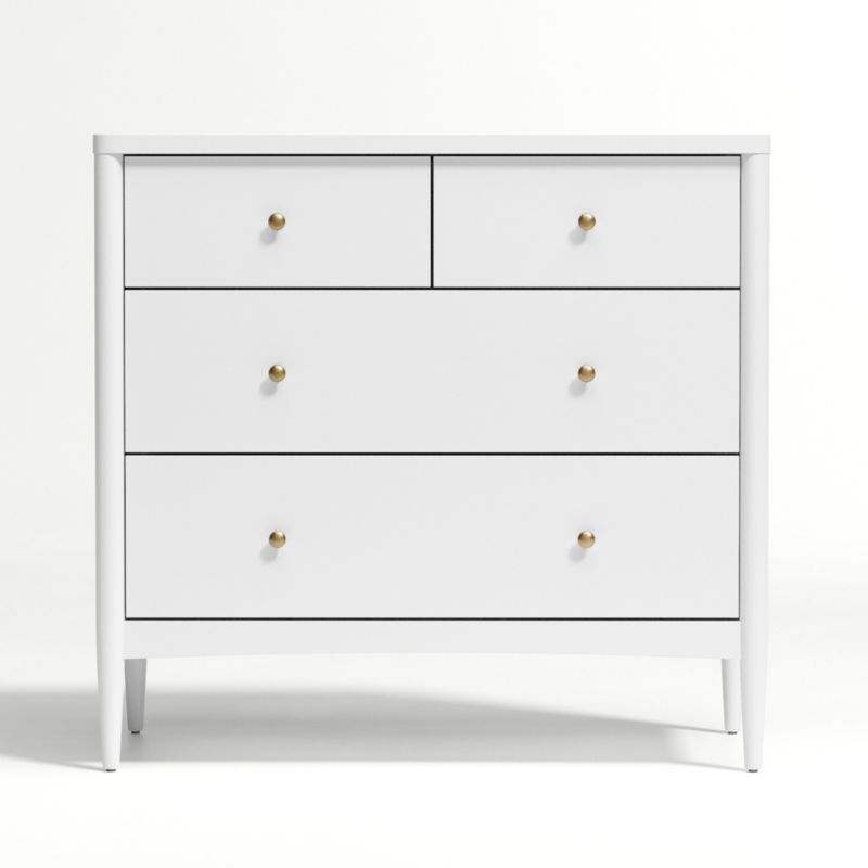 The clean, timeless design of our Hampshire White 4-Drawer Dresser means it'll fit in regardless of what kind of decor is in your kid's nursery or bedroom. It features a white finish that will never go out of style, plus plywood construction that makes it as durable as it is beautiful. Antique brass metal drawer pulls complete the look.