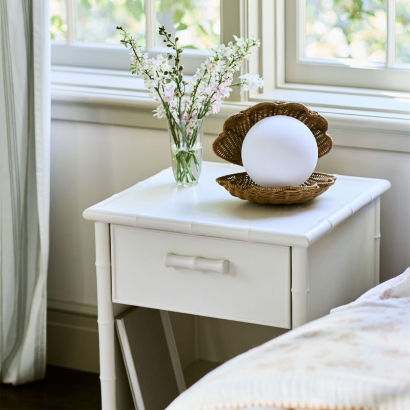 Our Harden bamboo nightstand may be a side player in a room, but it exudes star quality. Designed by Jake Arnold, the piece is finished with faux bamboo details for a dose of glamour and texture. The combination of a top drawer for essentials and an open cubby for books or toys provides just the right amount of accessible storage, while the bright linen white finish goes with everything. It's a grow-with-them piece that's equally at home in a nursery or a first apartment.
