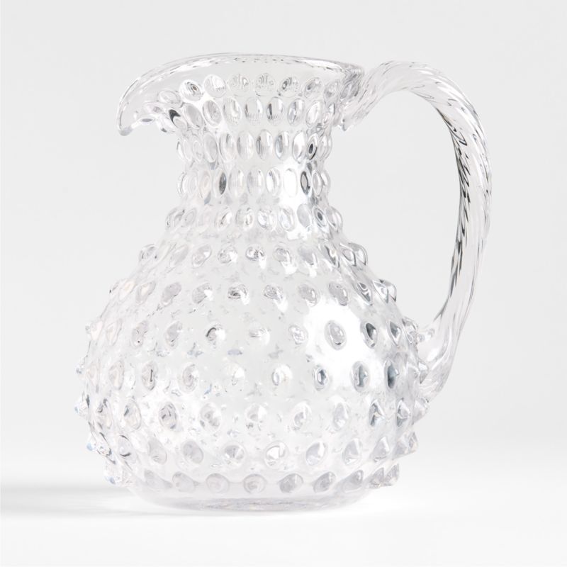 Super popular in Victorian times, hobnail glass revives its fun texture and retro flair for contemporary entertaining in our Harper glassware. Patterned with raised knobs resembling hobnail studs once used on boot soles, the hand-blown glass pitcher has a curvy, vintage-inspired silhouette and a plain glass handle for easy pouring of ice water, batch cocktails or sangria.