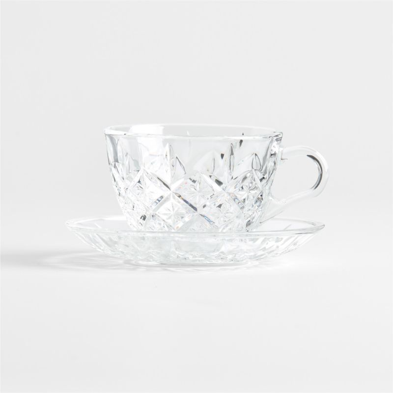 Our Hatch cup and saucer looks like an heirloom classic, molded in a diamond pattern to resemble cut crystal. With its timeless style, the cup and coupe-shaped saucer add a bit of fancy to coffee, tea or mulled wine.