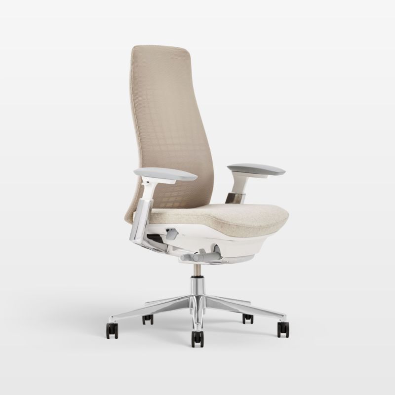 Inspired by the natural suppleness and beauty of a fern leaf, this office chair provides new levels of balance, flexibility, and performance. Designed in consultation with experts in biomechanics, physical therapy, and kinesiology, Fern evenly distributes weight as you move to relieve pressure. The patented Wave Suspension system mimics the human spine and cradles the body in comfort. Innovative 4D arms not only adjust in height but also move in multiple directions for customized support. Upholstered in soft felted wool in a sandy hue, the seat is complemented by an airy mesh back in a beachy neutral that delivers firm support and naturally regulates body temperature by letting air pass through.