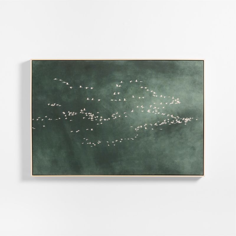 Our giclee print of the original photograph captures a flock of birds taking flight. Appearing as flecks of white against a dark sky of deep, modulated green tones, the flight formation takes on an abstract quality that gives this work its contemporary edge. Each print is presented in a wood floater frame with a natural finish.