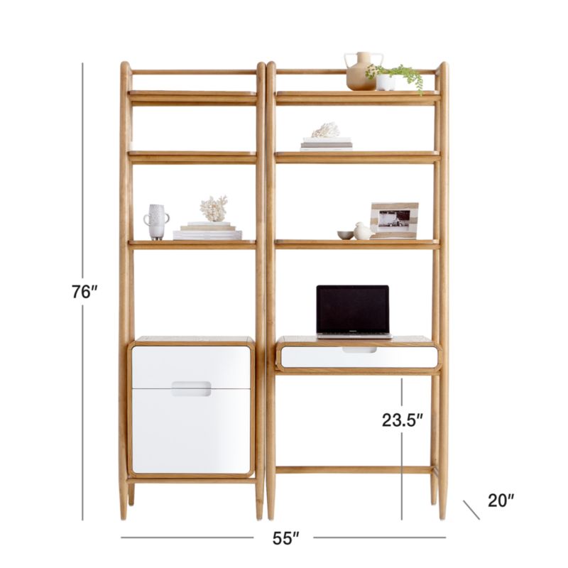 With its clean lines, rounded edges and light finish, our Helsing bookcase and desk set takes inspiration from the warmth and playfulness of Scandinavian design. Helsing's space-savvy design brings together two angled bookcases integrated with storage, one with a desktop and drawer and another with a drawer and file cabinet. Made of oak veneer, the ladder-style bookcases each stack three shelves in an open format for books, picture frames and a potted plant or two. The integrated desk and storage units feature rounded corners and are fronted in white lacquer for fresh contrast. Designed for us exclusively, the Helsing bookcase with storage is a stylish and space-saving option for multi-tasking rooms.