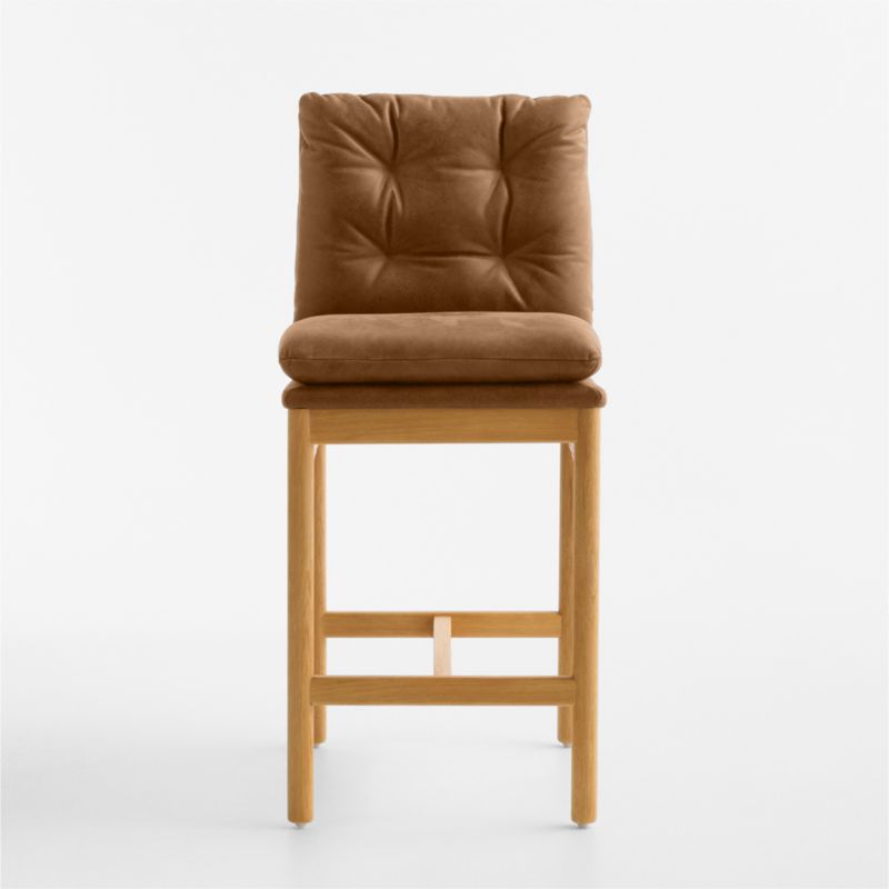 Our Henning stool pulls up to a counter or high dining table with the same expert woodworking and luxe comfort of its bestselling living room counterpart. Finished by hand, the solid oak frame features turned dowel details at the top of the back and a sling-like design that floats the seat at a slight comfortable recline. Semi-attached cushions tailored with crosshatch pintucks on the back enhance the elegant rusticity of the exquisite leather.