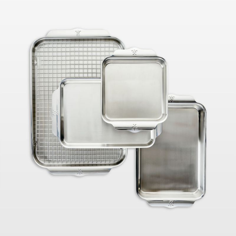 Bake cakes, cookies, bars, biscuits and more with this helpful five-piece set. Polished on the exterior with brushed baking surfaces, each warp-resistant pan boasts a tri-ply stainless steel construction with an aluminum core for exceptional heat conductivity and ideal browning. The cooling rack allows cookies and other baked goods to cool quickly and crisp perfectly. Finished with gracefully curved handles that provide a sturdy grip, this beautiful gift-worthy set includes a quarter sheet pan, half sheet pan with cooling rack, square cake pan and rectangular baker.