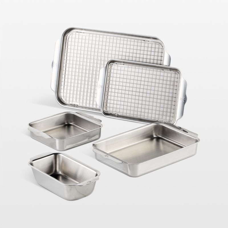 Bake pastries, roast vegetables and cook sheet-pan dinners with this versatile seven-piece set. Each warp-resistant pan boasts a tri-ply stainless steel construction with an aluminum core for exceptional heat conductivity and ideal browning. The racks come in handy for roasting, glazing and cooling baked goods quickly so they crisp perfectly. Finished with gracefully curved handles that provide a sturdy grip, this beautiful gift-worthy set includes quarter and medium sheet pans with racks, square cake pan, rectangular baker and loaf pan.