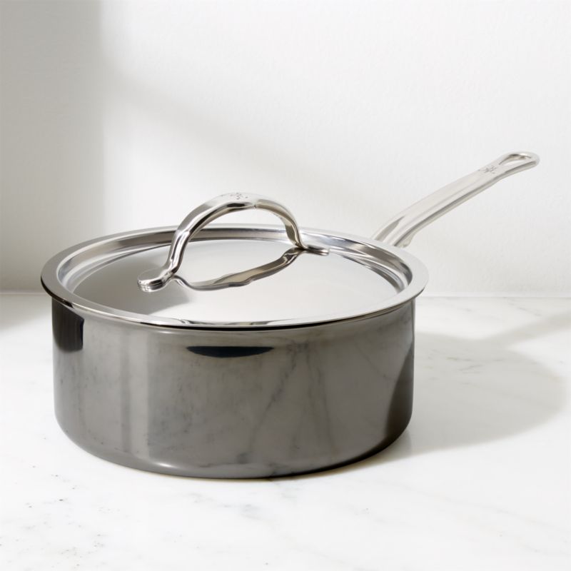 Harder than steel and 100% toxin-free, this hard-working saucepan offers exceptional heat conduction, tolerant to temperatures reaching over 1,000°F. Designed with a wider base and shorter sides, this large pan provides more cooking surface than typical pans so you can easily prepare family-size dishes. The science behind the pan's NanoBond technology unites micro-layers of titanium with stainless steel in a chemical-free and environmentally friendly process to create a stain- and scratch-resistant surface with brilliant luster. This lighter weight pan includes a flared rim for easy pouring and graceful ergonomic handle.